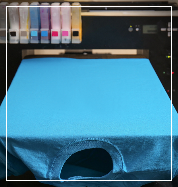The Direct-to-Film - or DTF - printing method is our specialty custom printing method. Utilizing a mix of CMYK inks (Cyan, Magenta, Yellow, and Black) we can print in full, dazzling color and in millions of colors, from logos to family photos. Each print is backed with a layer of white, guaranteeing that your design is clear and beautiful on top of any color item.